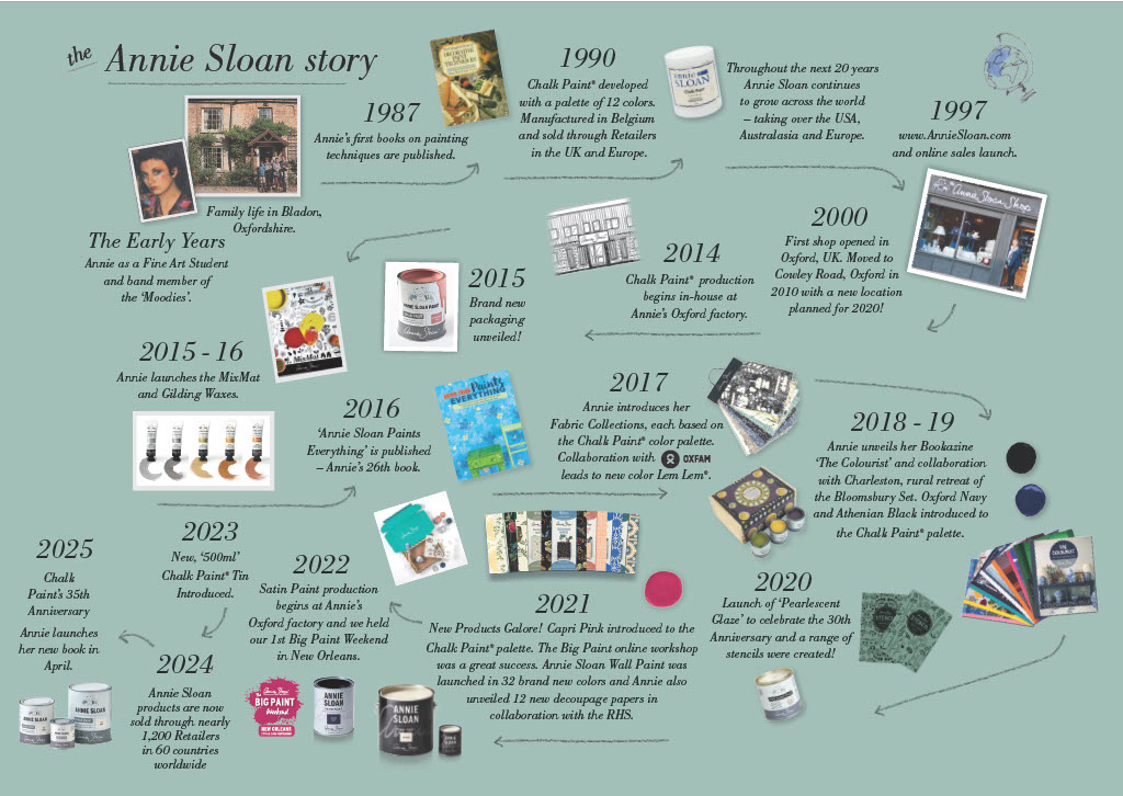 Annie Sloan, CBE, svetski je poznata umetnica, autorka i stručnjak za boje, stil i dizajn enterijera. Godine 1990. stvorila je svoju revolucionarnu Chalk Paint™ boju, kojom je zauvek promenila način farbanja nameštaja.