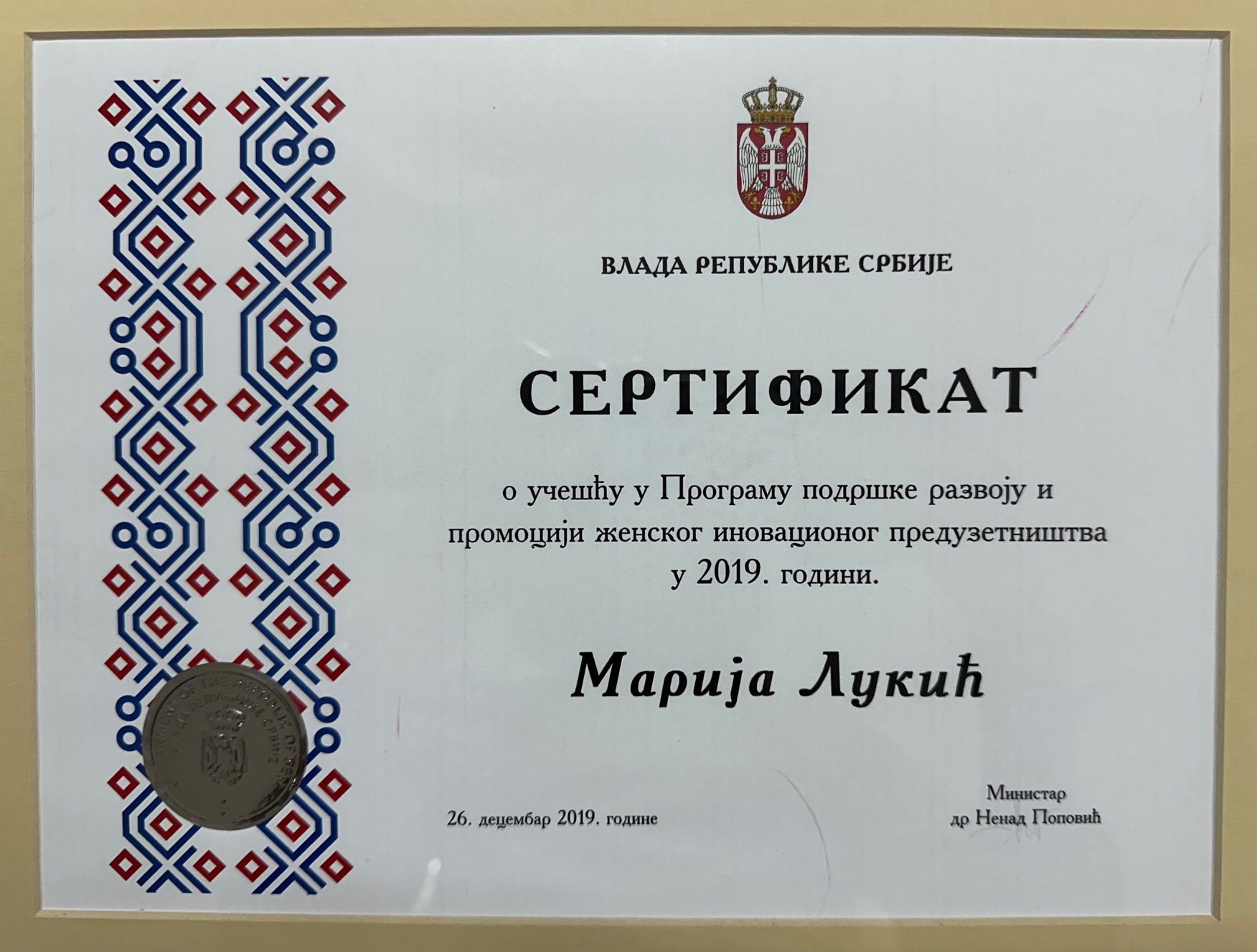 Sertifikat o učešću u Programu podrške razvoju i promociji ženskog inovativnog preduzetništva