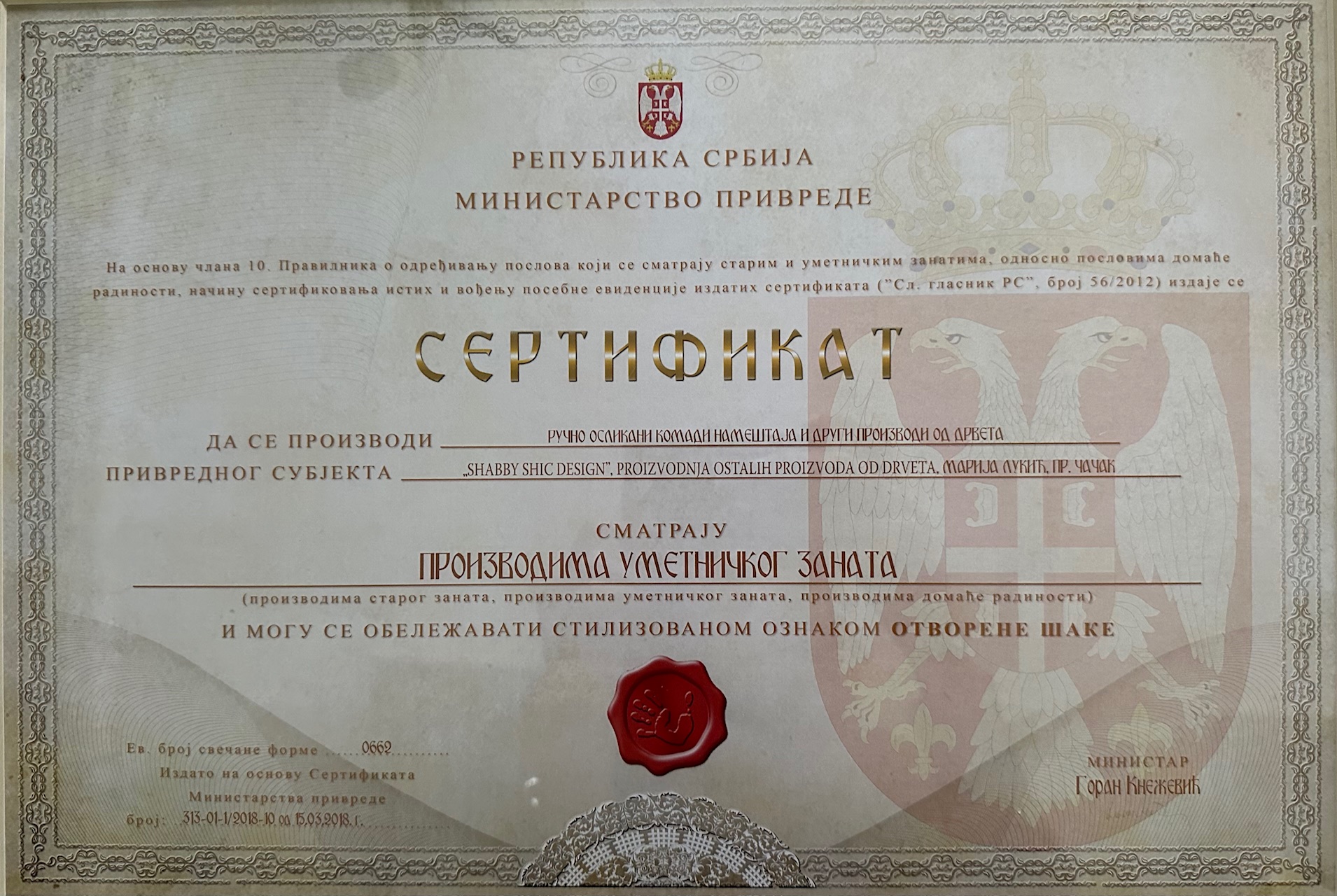 Atelje je 15.03.2018. dobio sertifikat Ministarstva privrede Republike Srbije kojim se potvrđuje da su naši ručno oslikani komadi nameštaja i drugi drveni proizvodi priznati kao proizvodi umetničkog zanata i mogu nositi stilizovanu oznaku otvorene šake. Na ovaj sertifikat smo izuzetno ponosni. Svi proizvodi nastaju isključivo ručnim radom, bez upotrebe mašina, što svaki komad čini jedinstvenim.