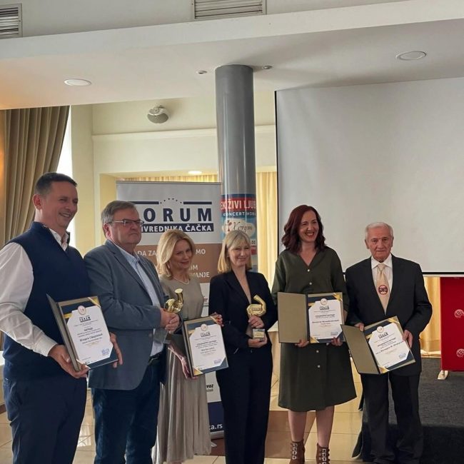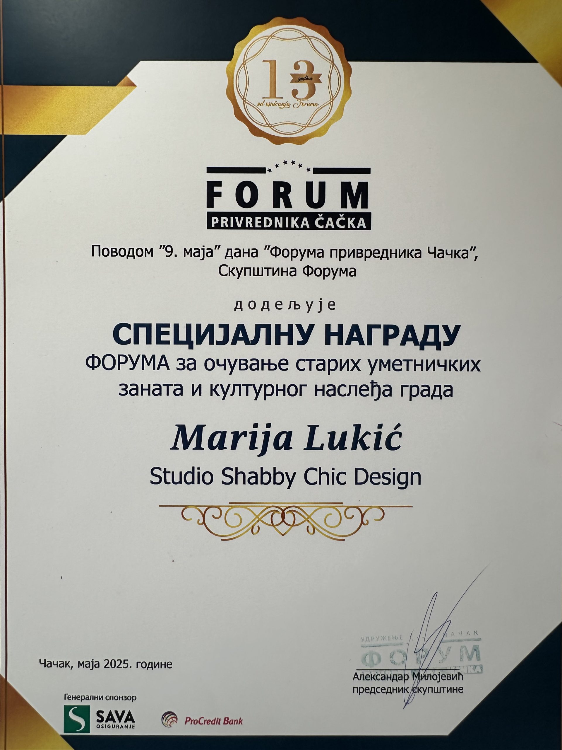 09.05.2025. Skupština foruma privrednika Čačka dodeljuje specijalnu nagradu foruma Mariji Lukić za očuvanje starih umetničkih zanata i kulturnog nasleđa grada.